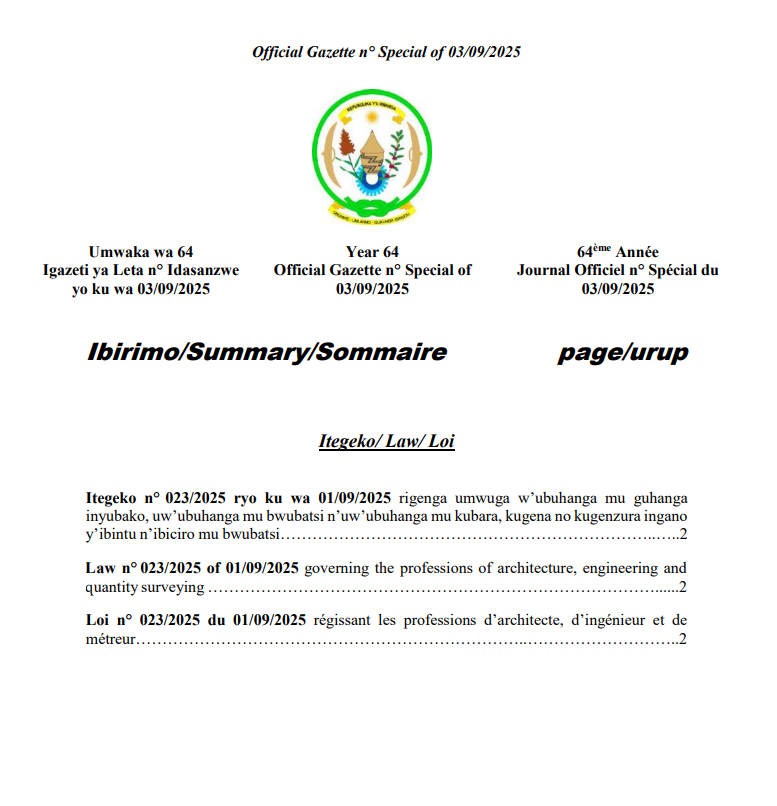 Law n° 023/2025 of 01/09/2025 governing the professions of architecture, engineering and quantity surveying