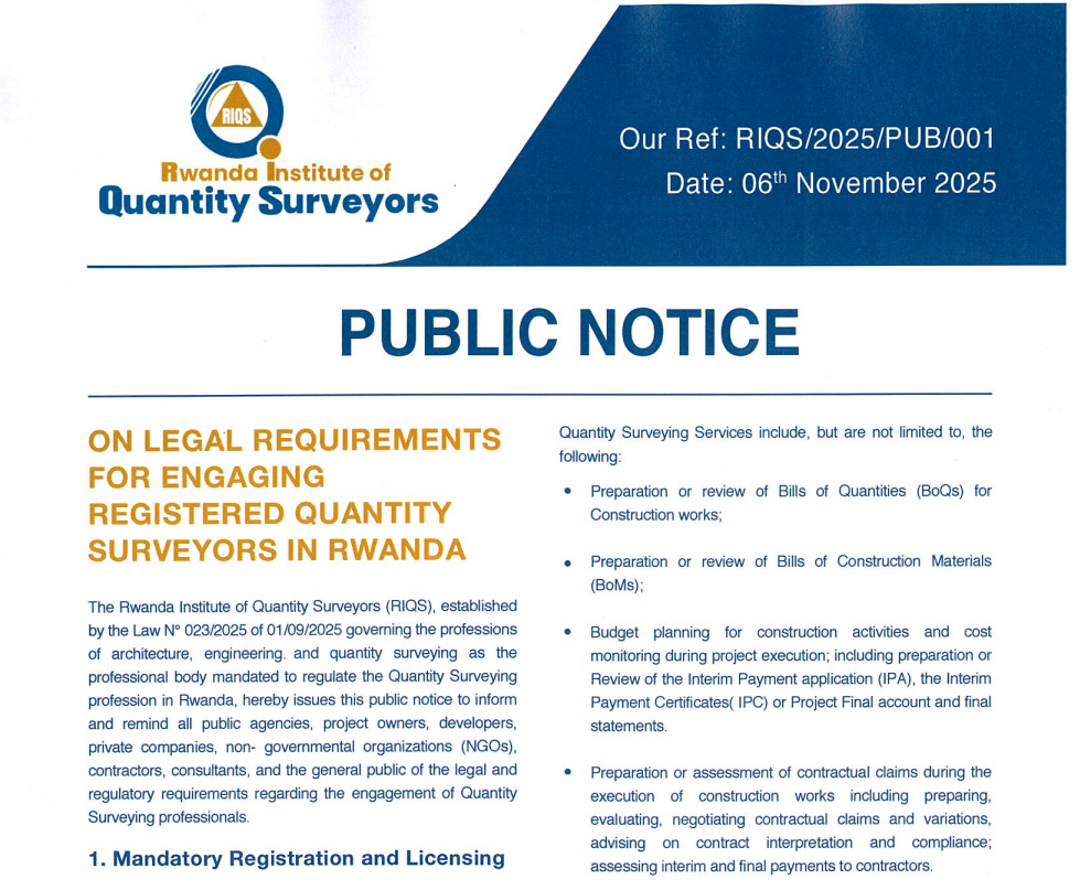 __PUBLIC NOTICE__ ON LEGAL REQUIREMENTS FOR ENGAGING REGISTERED QUANTITY SURVEYORS IN RWANDA